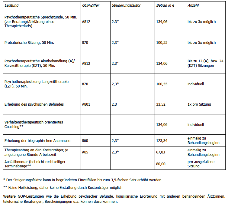 Hier finden Sie Informationen zur Kostenübernahme durch unterschiedliche Kostenträger. Sollten Sie eine Therapie über andere Kostenträger anstreben (z.B. Heilfürsorge der Bundeswehr etc.) zögern Sie nicht, mich zu kontaktieren.